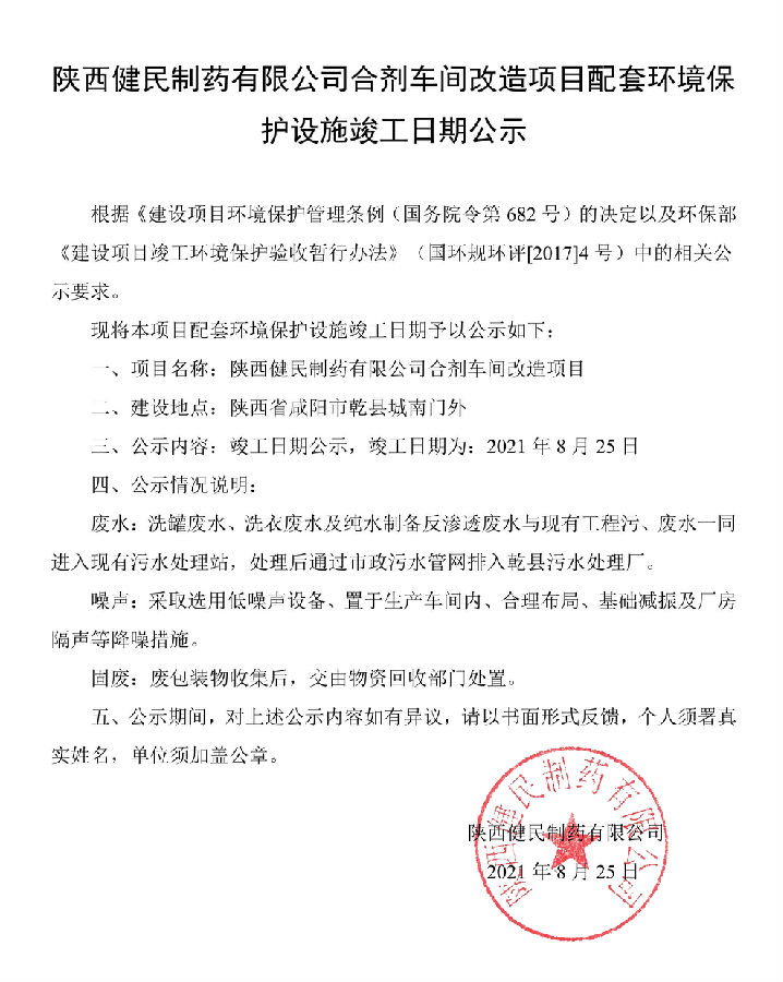 陕西健民制药有限公司合剂车间改造项目配套环境保护设施竣工日期公示