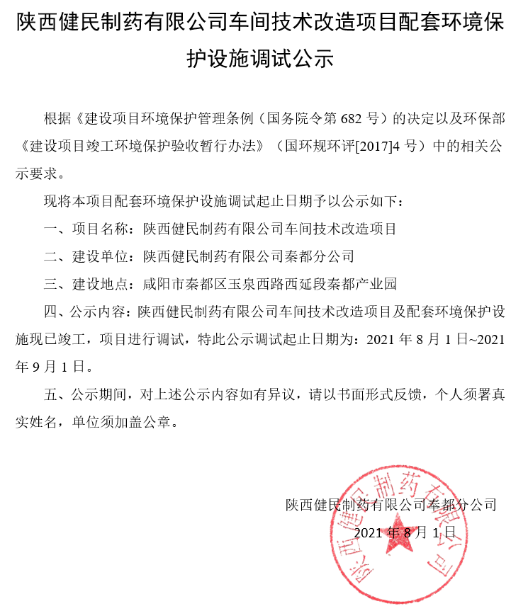 陕西健民制药有限公司车间技术改造项目配套环境保护设施调试公示