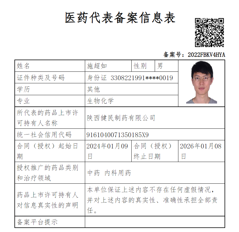 陕西健民制药有限公司医药代表信息公示
